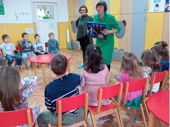 Гостите-едукатори на децата им одржаа интересна активност во форма на интерактивна презентација на делата, со цел развивање на креативно размислување, љубопитноста кај децата.